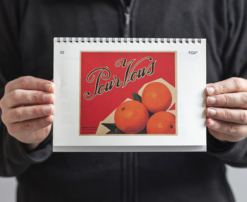 La imprenta Fernando Gil rinde un homenaje a la memoria gráfica de la naranja valenciana con su archivo anual, que este año propone un desplegable, un calendario de pared, un calendario de mesa y un planificador semanal que presentan, en cada página, una pequeña joya del diseño gráfico valenciano, rescatando etiquetas originales de la segunda mitad del siglo XX, destinadas a la exportación y recuperando el arte efímero que construyó la identidad visual de esta fruta.