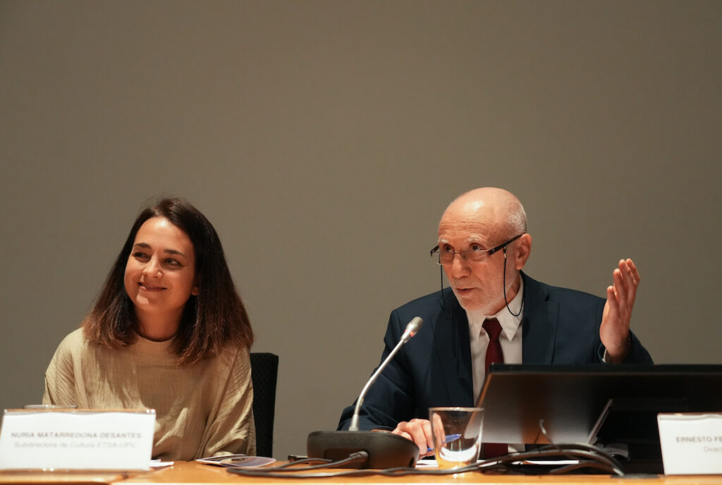 Antes de la conferencia de Rafael Aranda, el director de la ETSA, Ernesto Fenollosa, y la subdirectora de Cultura de la escuela, Nuria Matarredona, presentaban el programa cultural de la institución para lo que queda de curso, donde impera «una mirada holística y completa sobre la arquitectura».