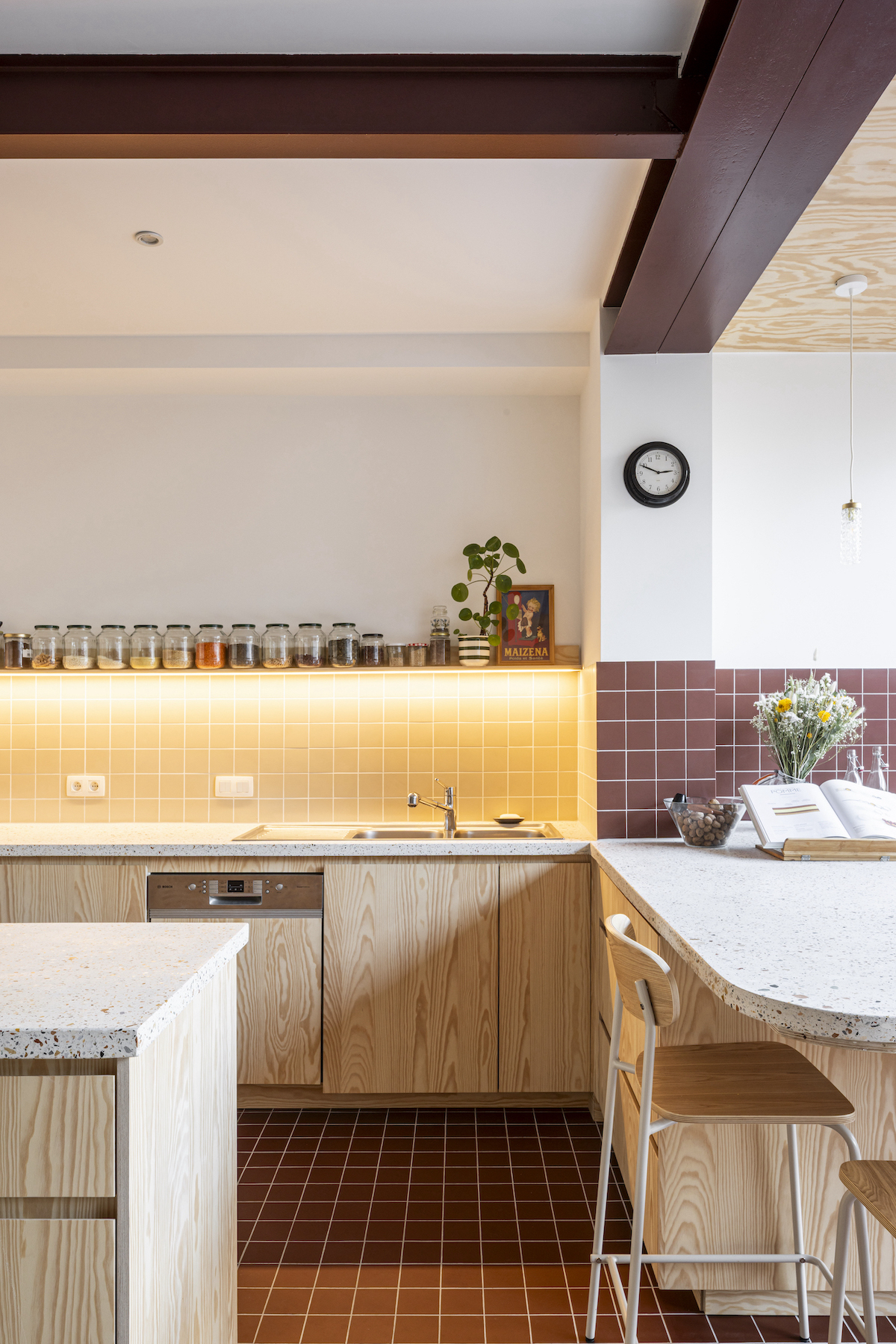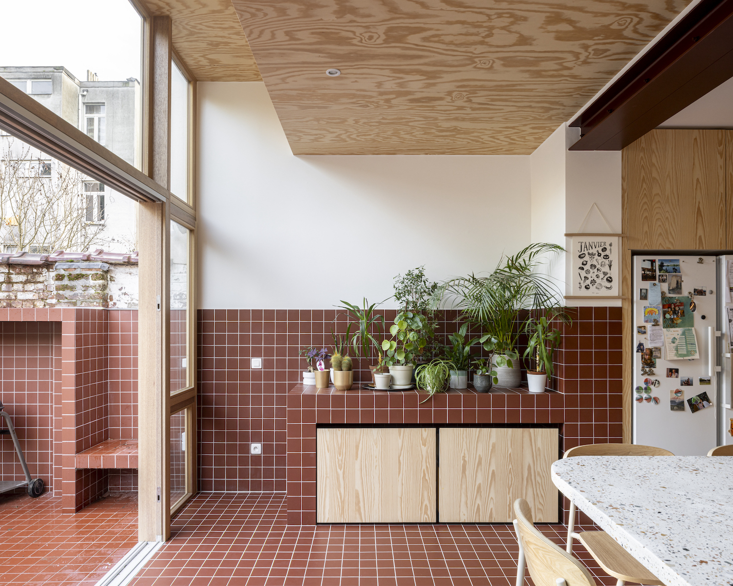 La nueva fachada, aprovechando su orientación a noreste, se convierte en un plano de vidrio y dliuye los límites entre la casa y el jardín. Esta voluntad de prolongar los espacios interiores hacia el patio se refuerza con los revestimientos: los elementos nuevos se alicatan con azulejos de color rojo oscuro, que se extienden hacia el exterior, a través del pavimento, pero también a través de unos zócalos laterales, y se crea una terraza que actúa como continuación de la cocina. «Dada la longitud de la planta, planteamos un detalle especial en la parte superior de la fachada de vidrio, retranqueado el forjado de la primera planta, permitiéndonos atrapar la mayor cantidad de luz posible».
