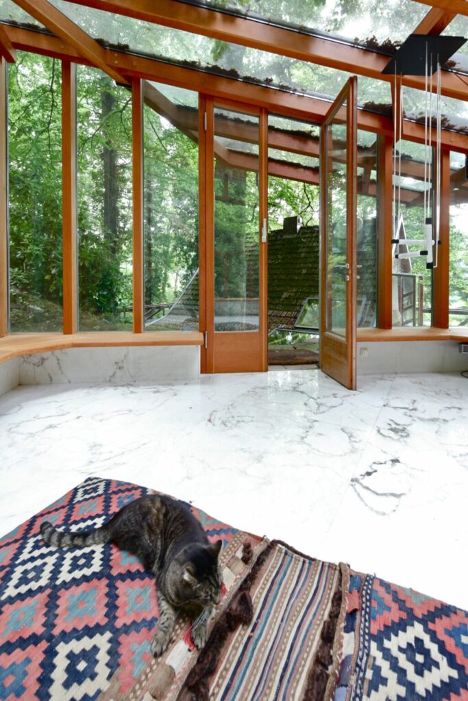 Como contaba Bach en HIC Arquitectura, teniendo esto en cuenta se entiende mejor el proyecto: «el primer porche tiene un cristal triangular en el suelo, volando respecto la cota de salida, con vistas a la cota inferior, para que Karlhen pueda controlar el jardín y cazar ratones sin ser descubierto. O la galería que mira al río, tiene dos asientos. Uno a escala humana, donde cabe una persona en posición paralela a la fachada, y otro justo enfrente, pequeño, a la escala de Karlhen y a una altura tal que permite que los ojos del gato y los de Axel estén al mismo nivel para poder entablar una conversación en condiciones».