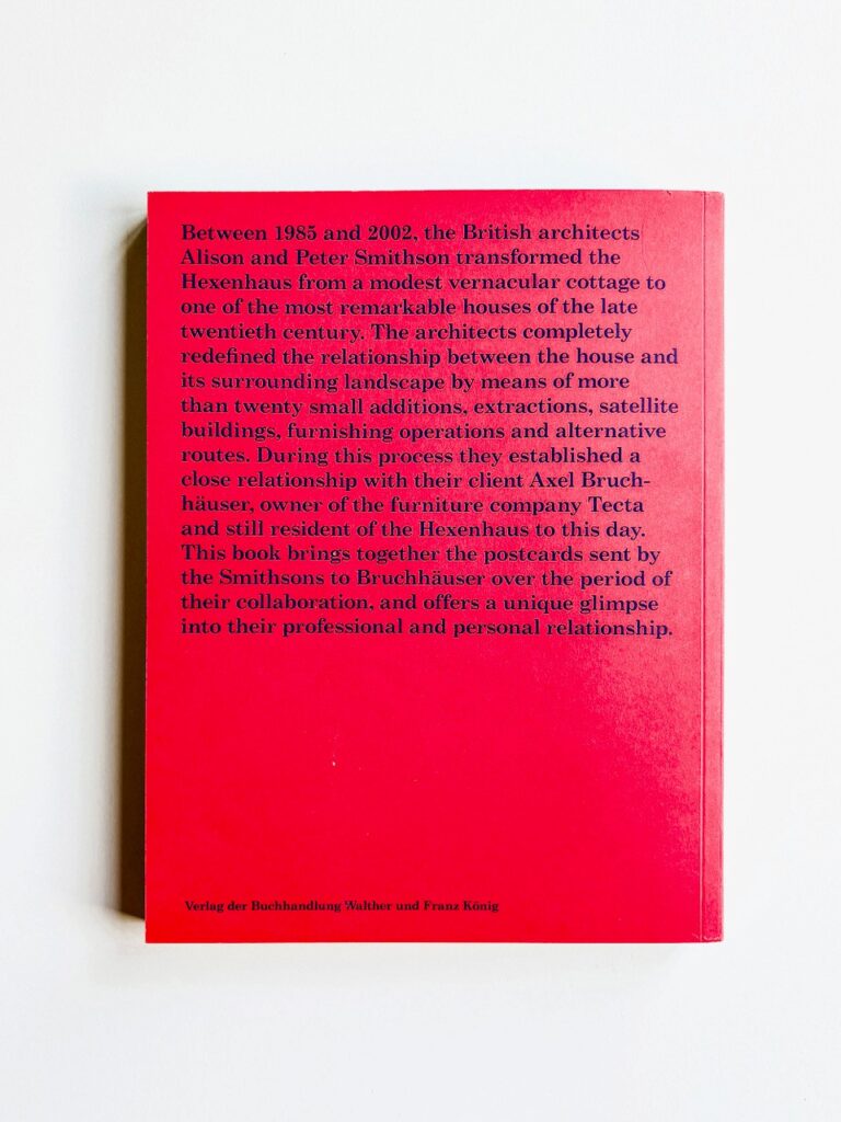 “Dear Axel… 99 Postcards from Alison and Peter Smithson” es fruto de la investigación de Anna Bach para su tesis doctoral, presentada recientemente en la Escuela Técnica Superior de Arquitectura de la Universitat Politécnica de Cataluña. Editada por Verlag der Buchhandlung Walther und Franz König, la publicación reúne 99 postales enviadas por los arquitectos al propietario de la Hexenhaus.