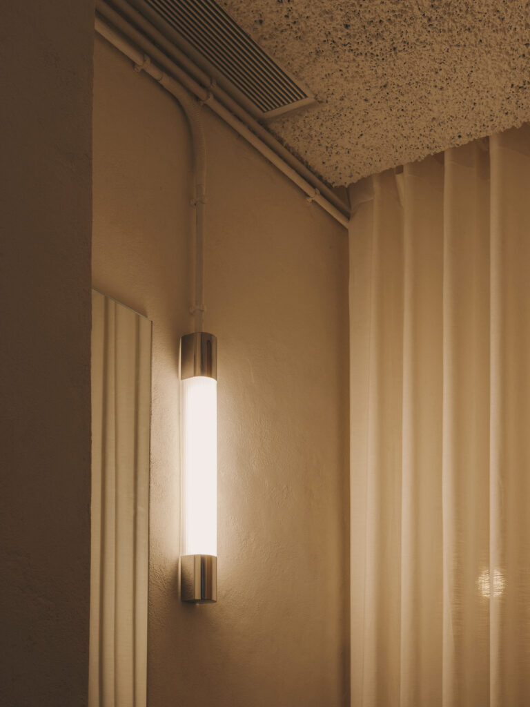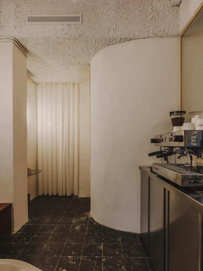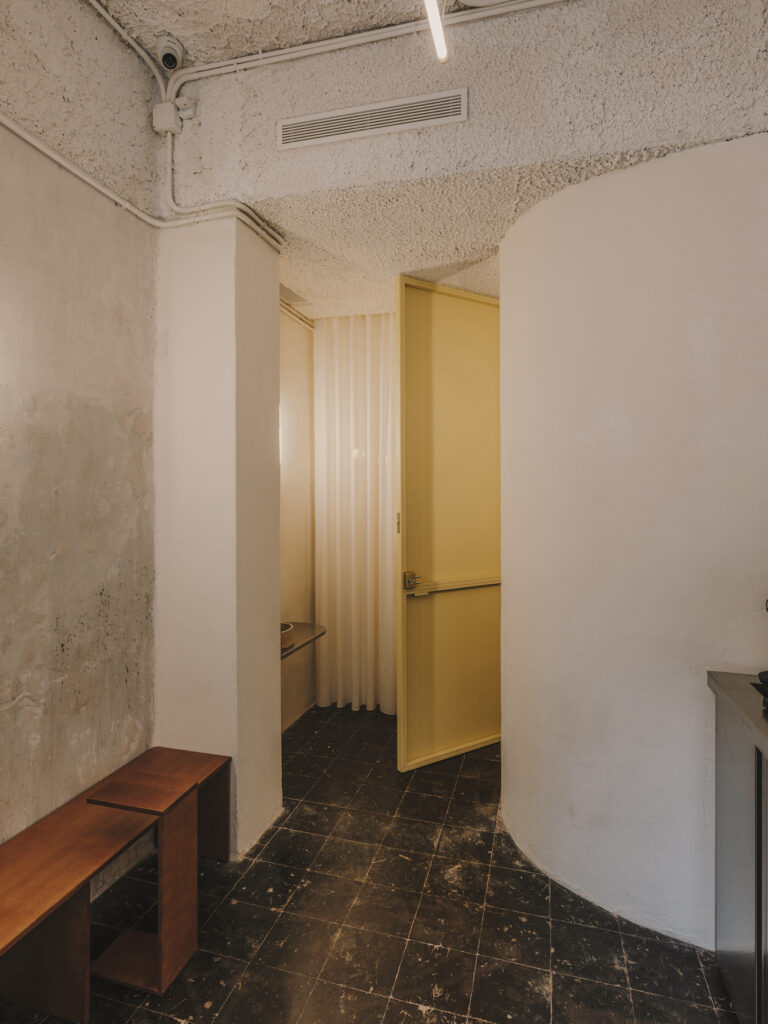 El espacio se construye desde el respeto a la memoria del lugar, apuntan. «Lejos de ocultar las huellas del pasado, la intervención decide ponerlas en valor: el suelo negro original se conserva para anclar el proyecto a la tierra, mientras que una de las paredes, salpicada de manchas de tinta de la antigua copistería que ocupaba el local, se mantiene intacta como un lienzo que narra la historia del local».