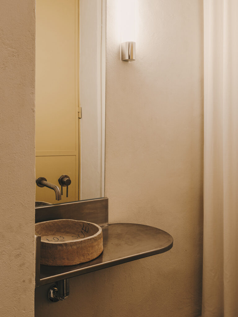 Un elemento curvo se eleva en la sala, «rompiendo la ortogonalidad y dinamizando el espacio» para resolver la normativa del aseo. Sin embargo, el ritual del lavado de manos se exterioriza, «entendiéndose como parte de la experiencia de comer con las manos». Aquí, el detalle cobra vida: sobre una plancha de acero descansa un lavabo cerámico realizado por estudio Vernís y diseñado, curiosamente, a partir de una receta de bollos suecos; un toque de gracia que aporta cercanía y carácter artesanal.