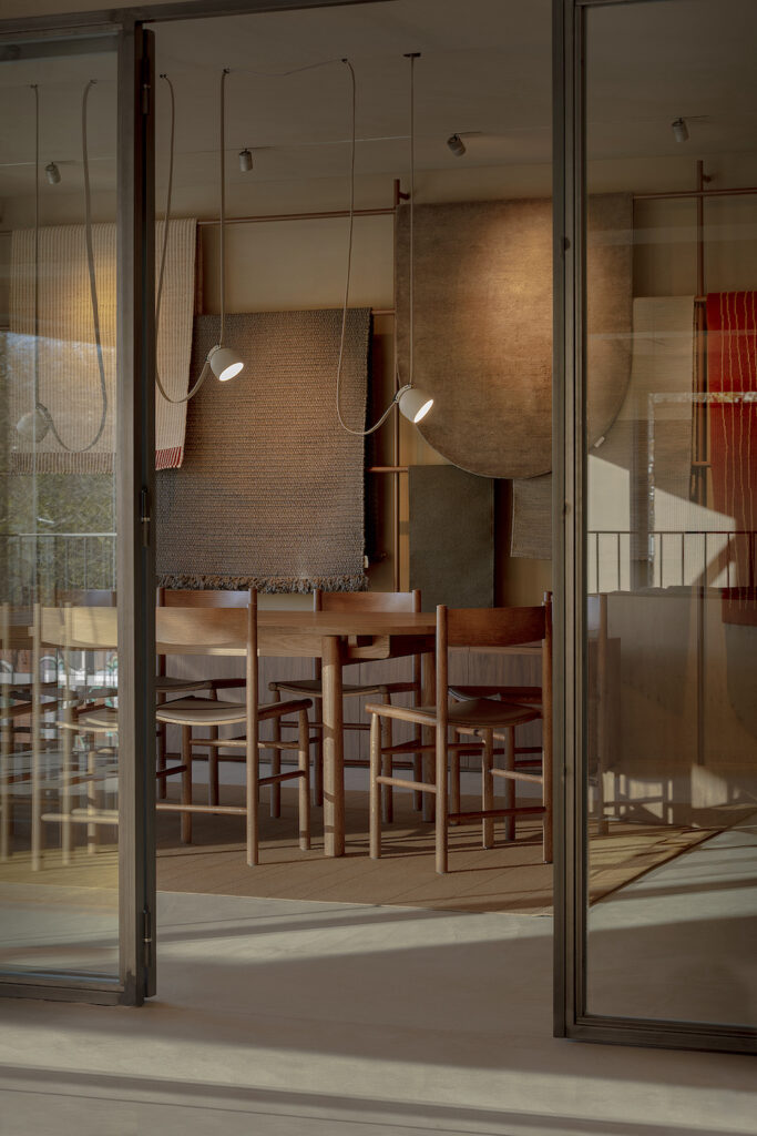Como elemento central, destaca una celosía de seis metros en nogal y cristal estriado que aporta privacidad a las oficinas y sirve de telón de fondo para alfombras suspendidas mediante el sistema de poleas que permite exhibirlas de forma dinámica. La atmósfera se construye con materiales cálidos y naturales: paredes de cal, suelo de micromortero y techos acústicos en tonos tostados.
