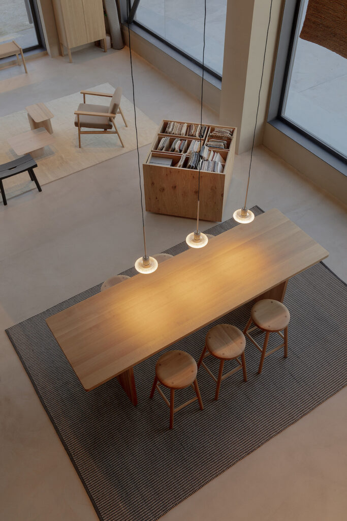En la oficina principal, un techo tensado con una alfombra de fibras naturales en colores tierra y negro aporta confort acústico y un guiño creativo al propio producto. El espacio integra mobiliario móvil para muestras, sistemas de correderas para organizar producto acabado y un almacén con entrada directa desde la calle. El resultado es un espacio que refleja la esencia de Cumellas: la unión entre artesanía y diseño contemporáneo.