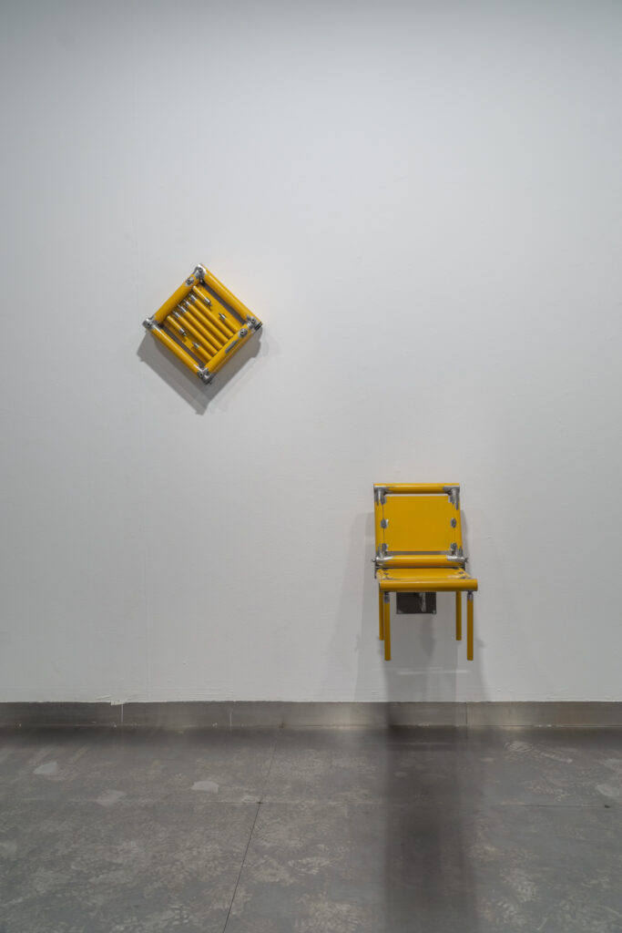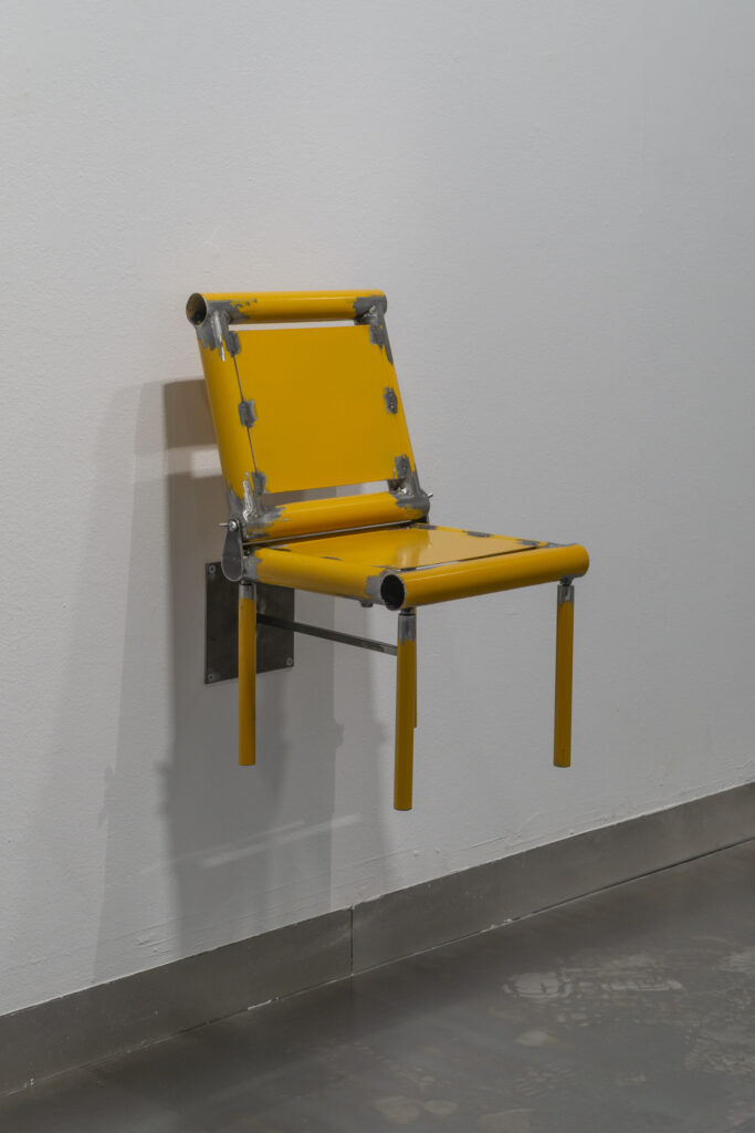 La primera obra, Todos juntos o de uno en uno, reinterpreta la barrera como balancín: un gesto que devuelve a la calle su dimensión lúdica y compartida. A partir de ahí, la investigación se amplía con piezas concebidas simultáneamente como herramienta y mobiliario improvisado, capaz de abrir paso o convertirse en apoyo para el descanso. «En las sillas, la transformación adquiere un tono más poético y político: frente a los dispositivos que desalientan la permanencia en el espacio público denominados como arquitectura hostil, estas piezas reclaman el derecho a detenerse y ocupar el lugar común», explica su autor.