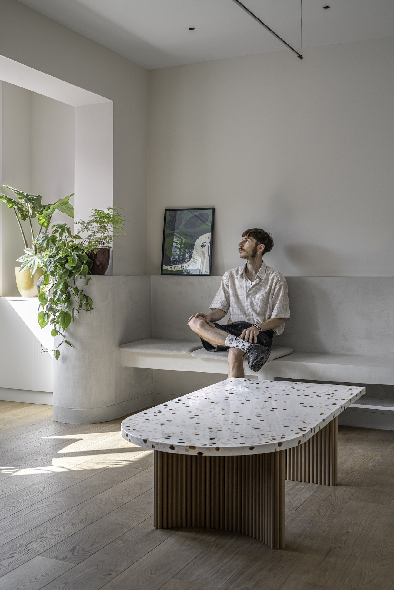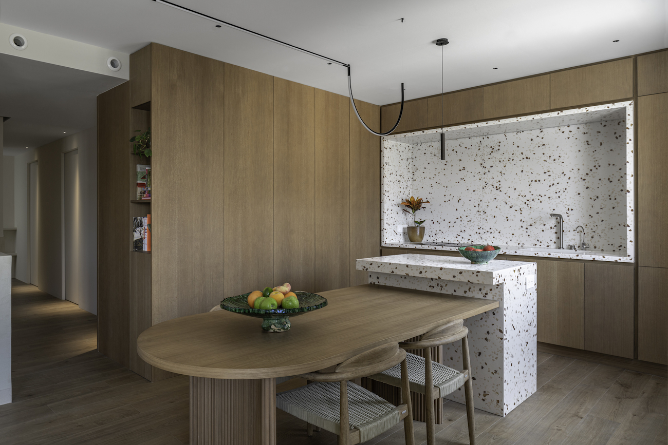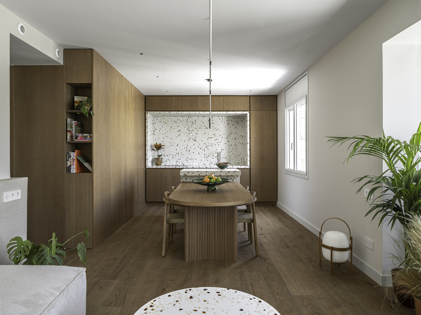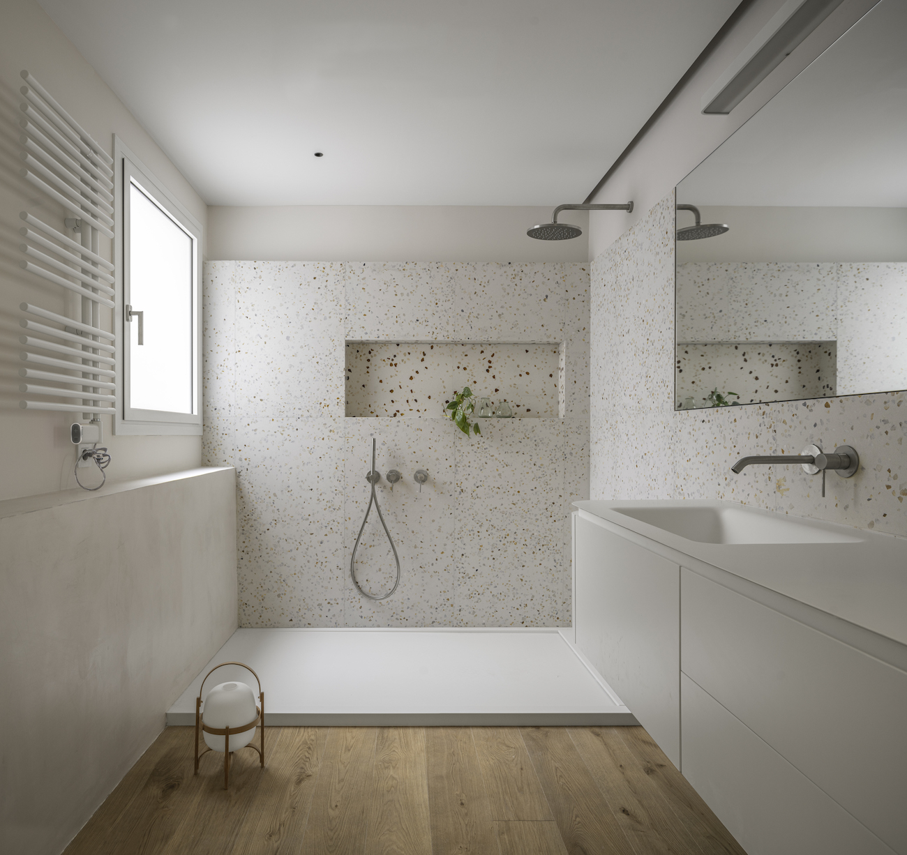 Este conjunto de elementos de mobiliario diseñado a medida para el salón-comedor-cocina está acompañado por la lámpara colgante que lidera el techo de este espacio, jugando con la línea y el semicírculo, potenciando así la longitudinalidad. La combinación de terrazos modula los dos baños y genera una conexión material entre los cuartos húmedos de la vivienda.