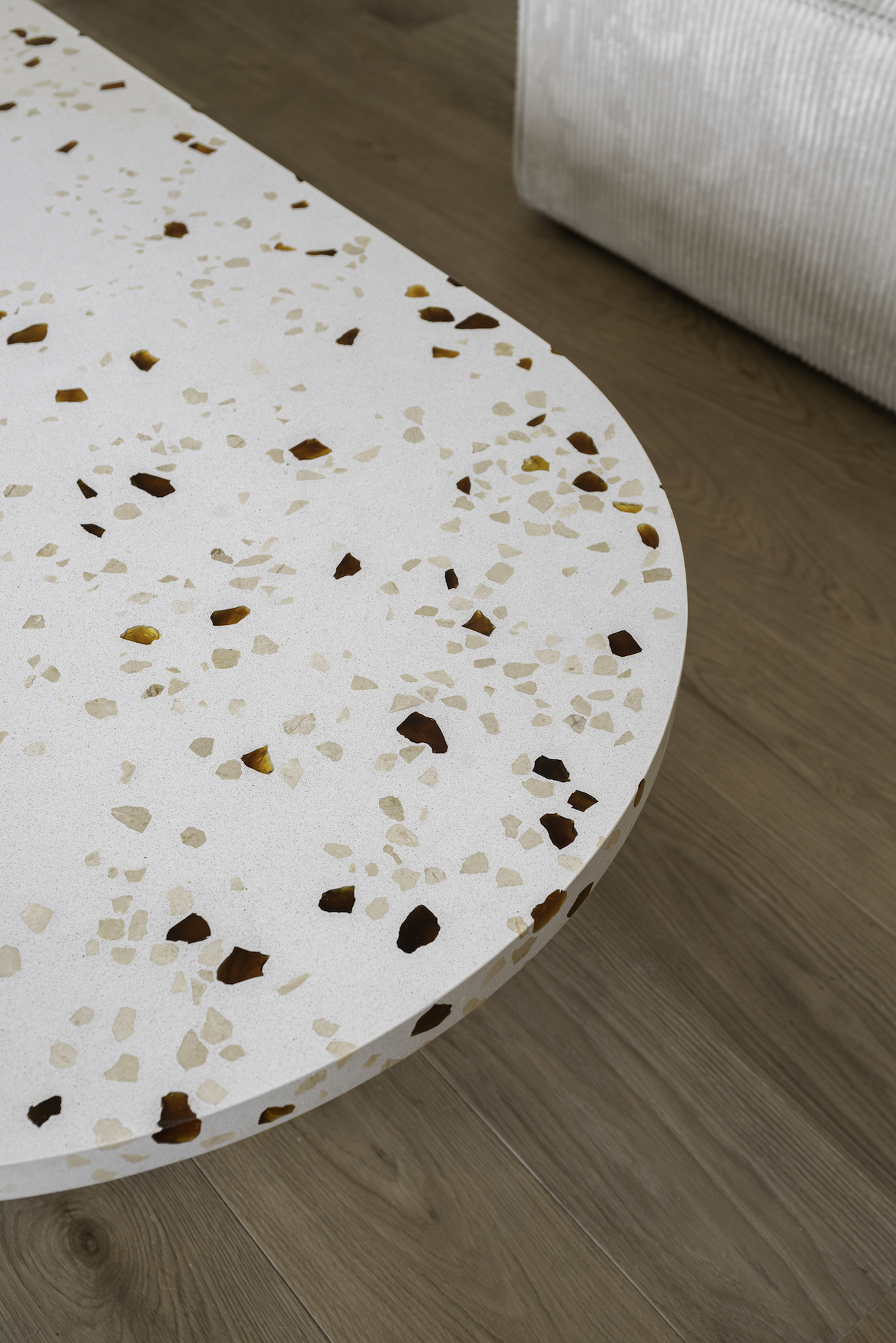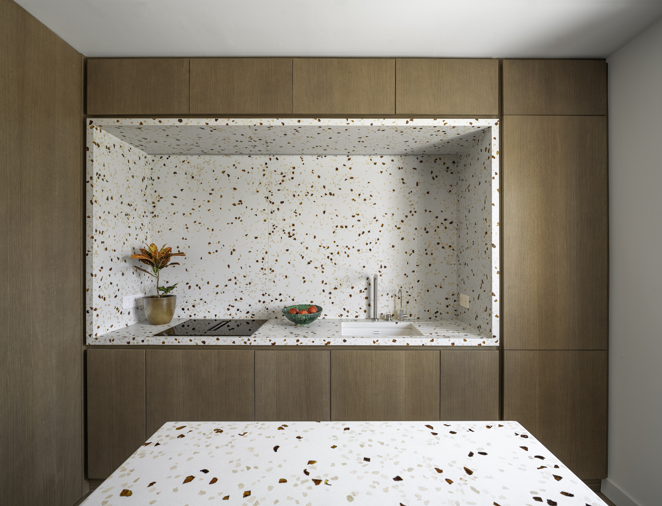 El verdadero protagonista de este proyecto es el conjunto encimera-isla-mesa de terrazo con incrustaciones de vidrio. Además de la belleza de su materialidad brillante, este conjunto de elementos funciona en línea estableciendo una perfecta unión entre el muro principal del salón y el de la cocina.