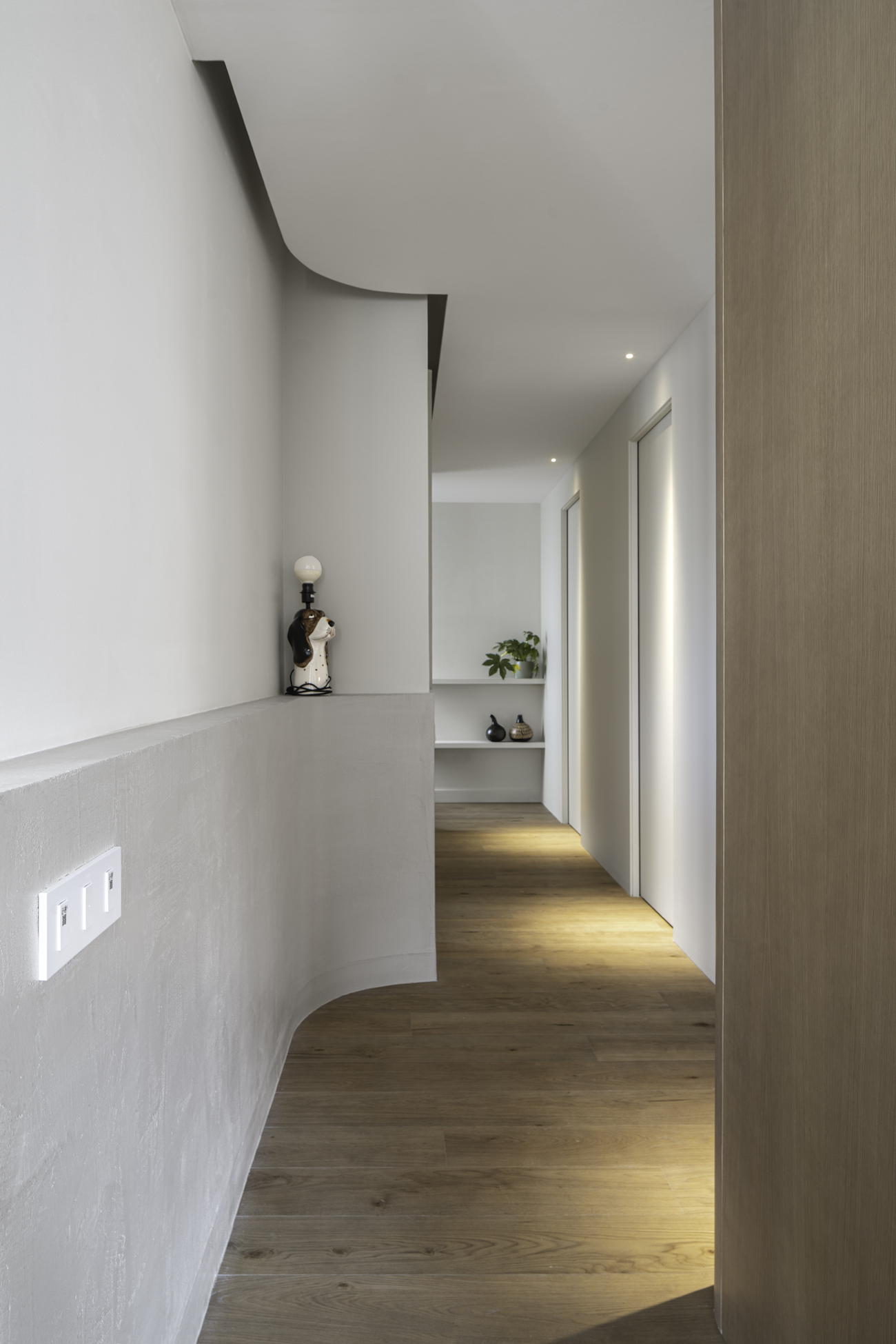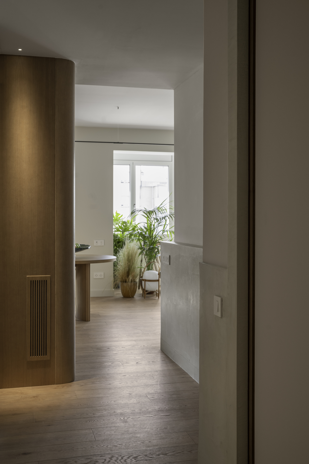 «El mundo del salón está protagonizado por un elemento arquitectónico que nace en el ventanal-galería y que se convierte en el murete, estantería, banco y pared que nos acompaña hasta el acceso con unos giros curvos rompiendo la ortogonalidad del espacio y aportando flexibilidad y diversidad. Un sutil gesto que se marca con un pequeño cambio de textura, granulometría y color. El mundo de la cocina está marcado por la madera de roble que hace que los blancos del salón sean todavía más cálidos», apuntan.