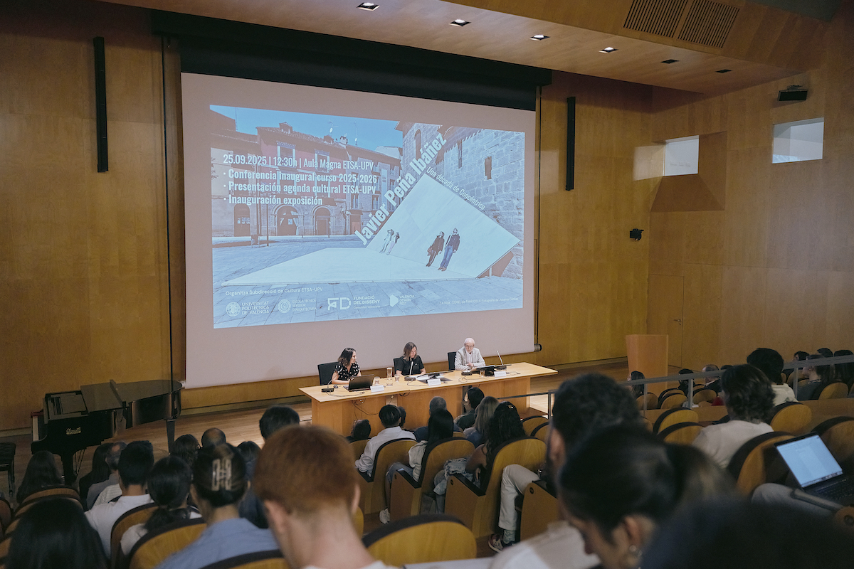 Antes de la apertura de la exposición tuvo lugar una conferencia de Javier Peña que sirvió para inaugurar el curso de la ETSA. En la imagen, Nuria Matarredona, subdirectora de Cultura de la escuela; Débora Domingo, Vicerrectora de Desarrollo Sostenible de la UPV; y Ernesto Fenollosa, director de la ETSA.