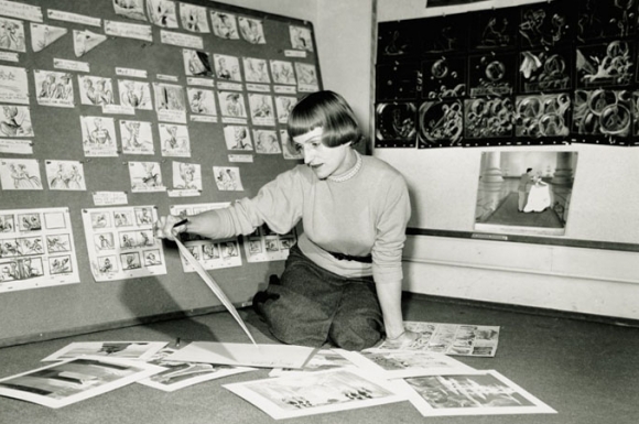Mary Blair revisando su trabajo en su estudio.