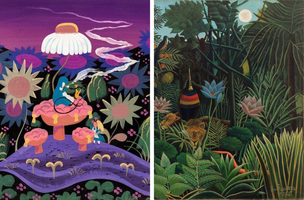Izq: Concept art de Mary Blair para Alicia en el País de las Maravillas. Dcha: El sueño (Henri Rousseau, 1910)