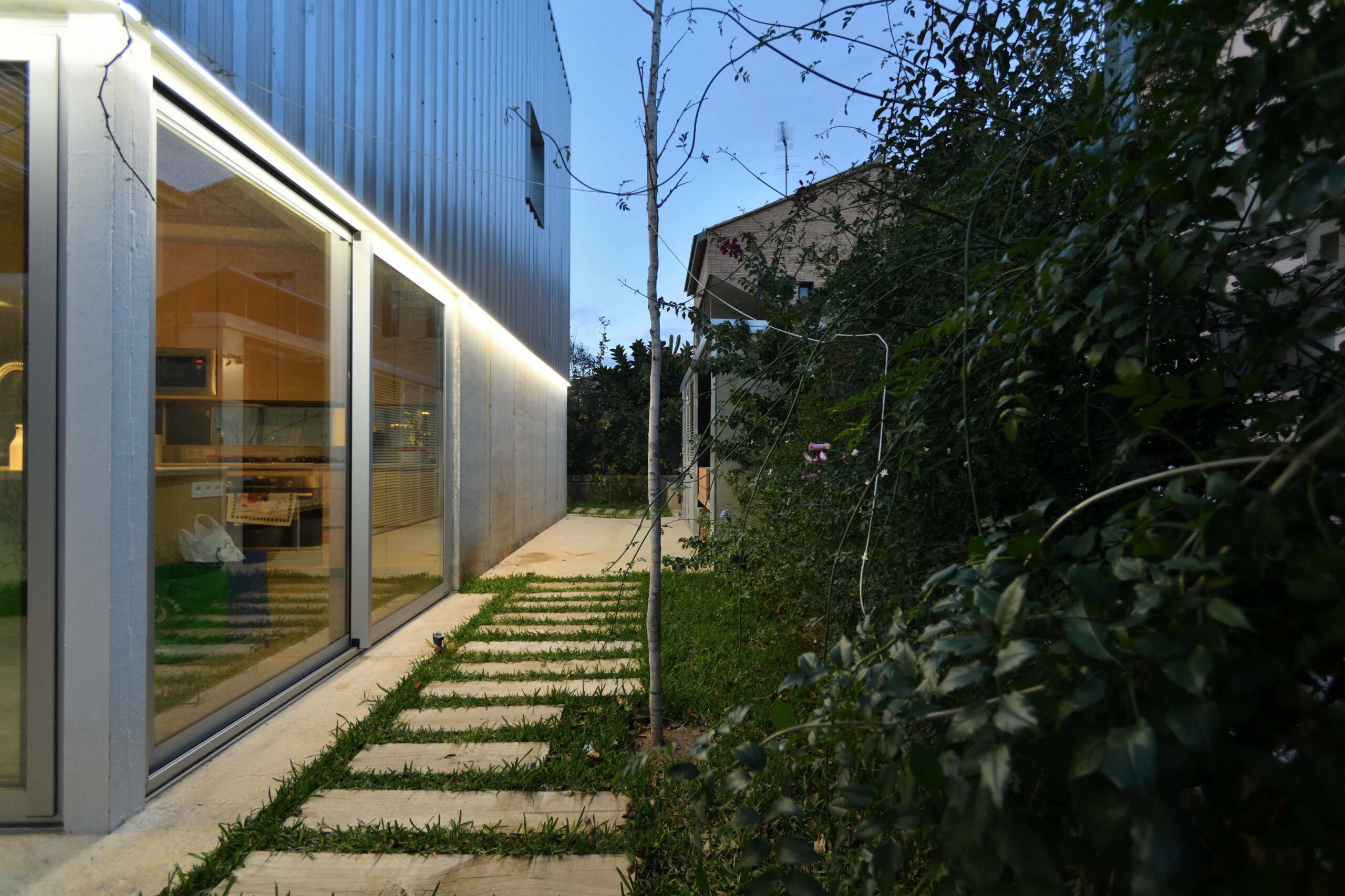 En la planta baja, lo construido flota sobre la parcela, liberándola: la cota cero construida es un porche que forma parte de la pequeña parcela jardín, «un espacio continuo donde vivir y estar», delimitado por los muros vegetales en los cuatro lindes de la parcela, con un futuro gran árbol y agua.