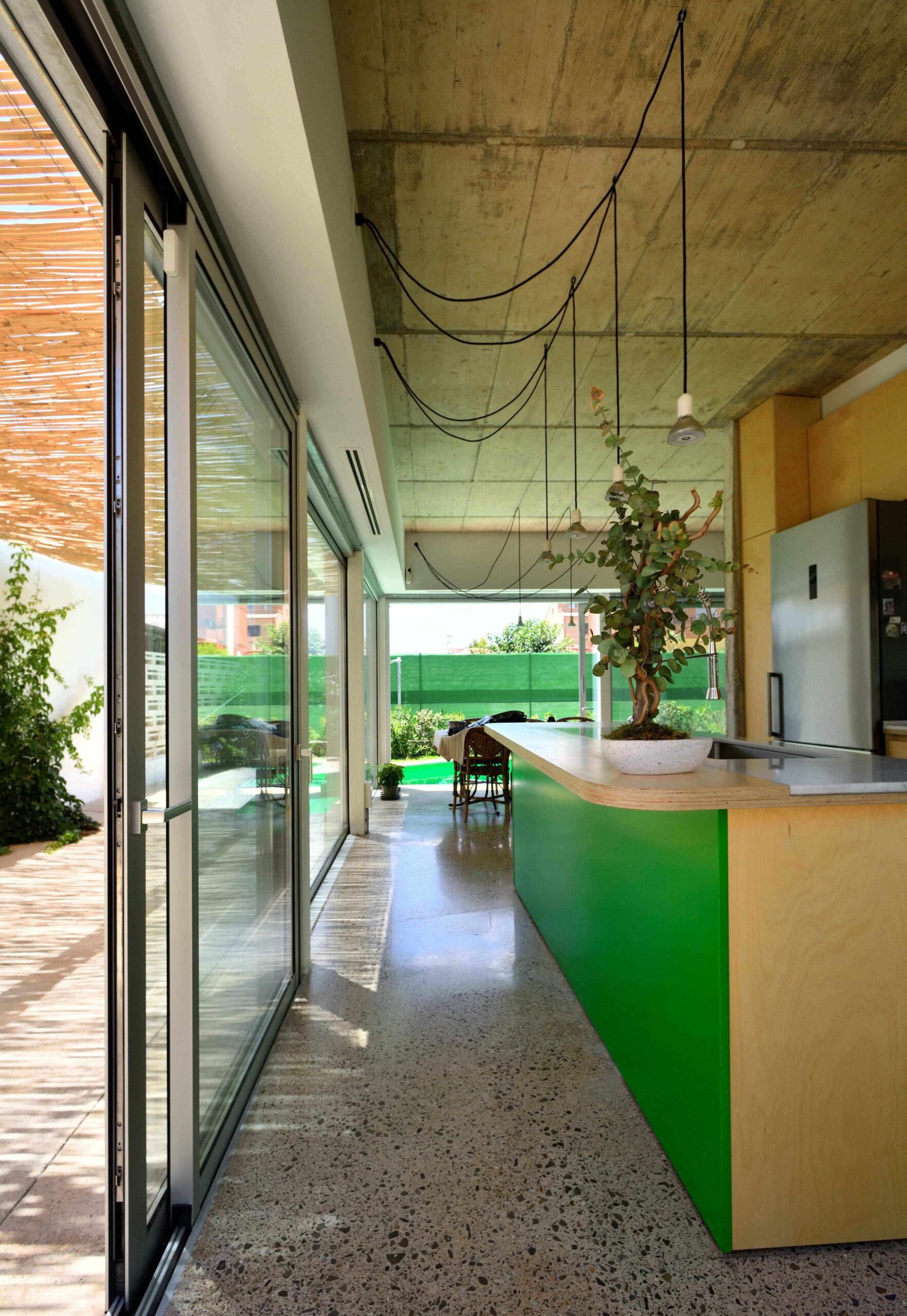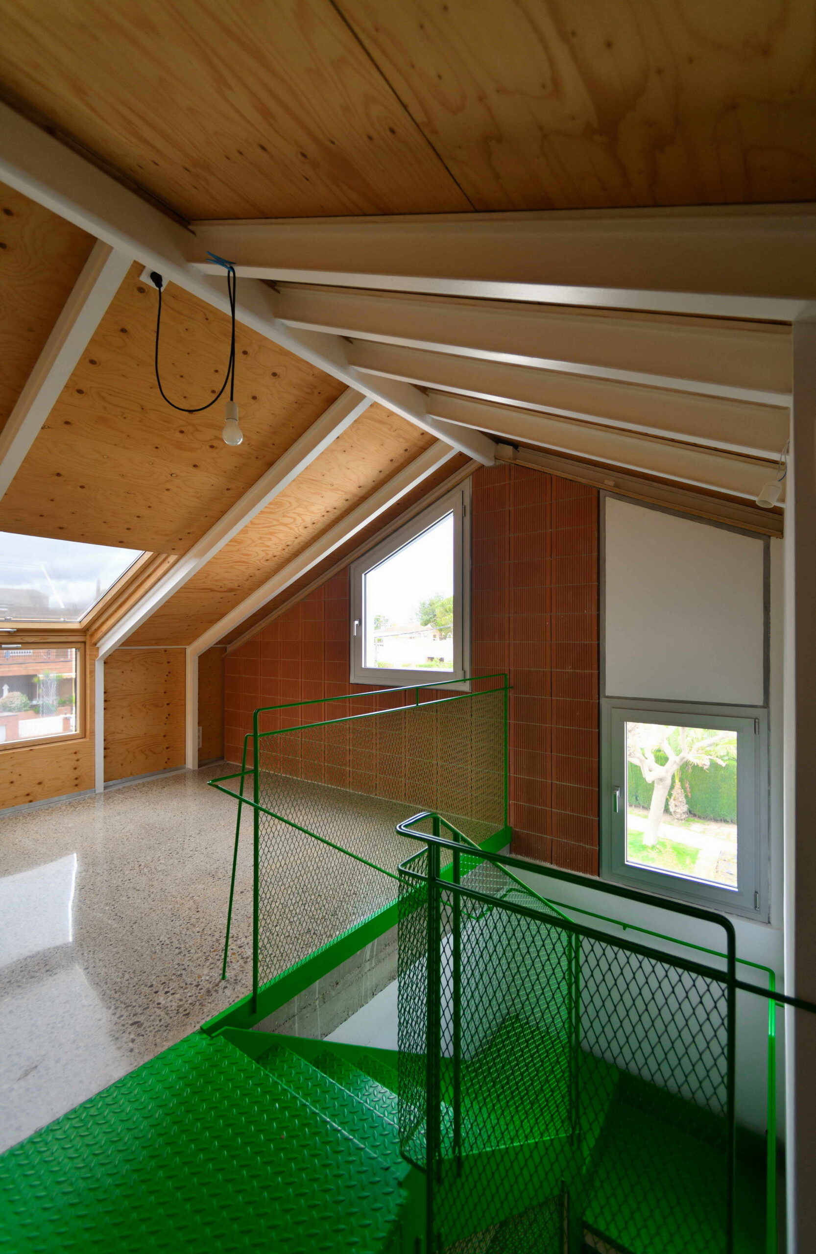 La escalera metálica ha sido definida, como el resto del proyecto, con precisión milimétrica, ejecutada en taller, y colocada en la obra como un elemento prefabricado. Un lugar de materiales donde sus acabados directos aportan las texturas y el color, del mismo modo que lo hace el jardín en la cota cero. Solo el color verde en los acabados pintados de la piscina, la isla de la cocina y la escalera metálica, se presenta en proyecto como algo elegible. «El verde se inició en el jardín, como verde natural y se extendió en los elementos protagonistas del proyecto», explican.