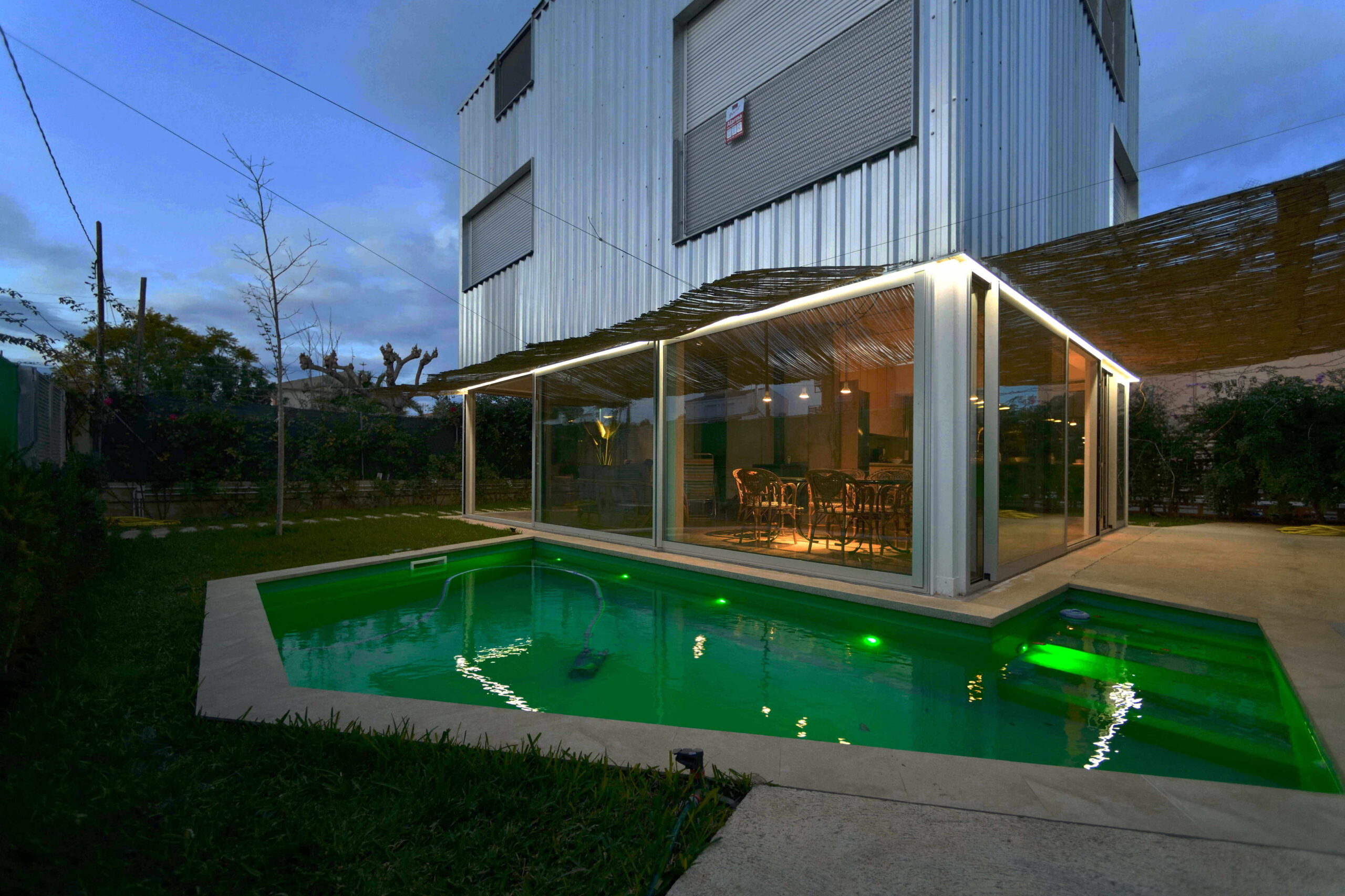 La cubierta y las fachadas definen una sencilla geometría de casita infantil, flotando sobre la planta baja abierta. Una cubierta a dos aguas, siguiendo la máxima envolvente legal posible, para obtener espacios interiores amplios en una parcela tan reducida: ligera, realizada mediante sándwich in situ de madera, y recubierta con chapa galvanizada, reflectante; con unas fachadas opacas que siguen a la cubierta, deslizándose el galvanizado hasta el acristalamiento continuo de planta baja.