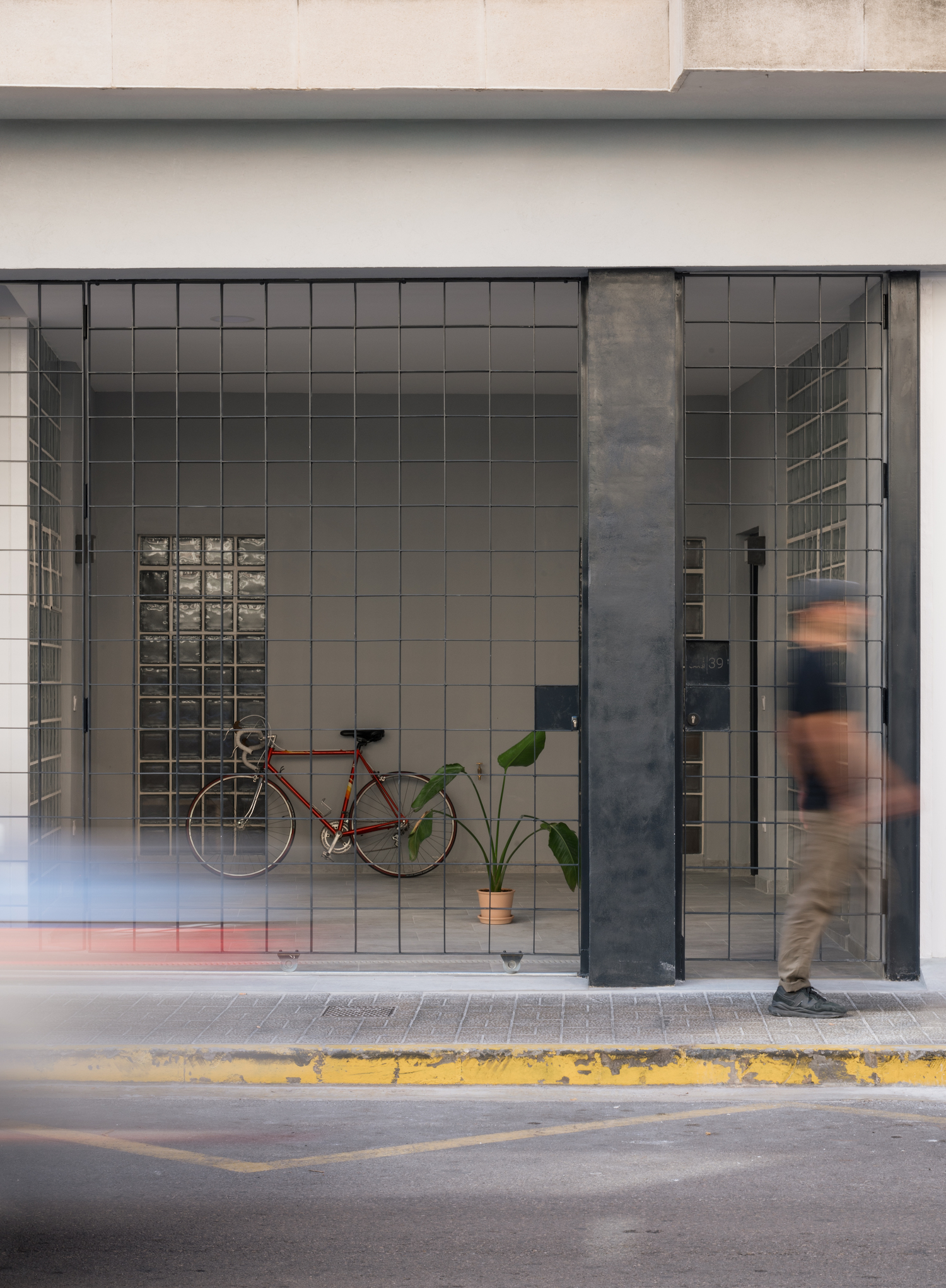 Sobre la trama de la fachada se combinan bloques de vidrio, «un material que garantiza luminosidad preservando la privacidad, con una malla metálica que prolonga el mismo patrón». Esta última actúa como filtro entre el espacio exterior y el patio de acceso, «delimitándolo sin aislarlo, y estableciendo un diálogo sutil entre lo público y lo doméstico», concluyen Kühnel y Picco.